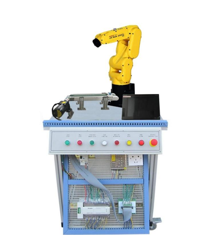 由发那科 Mate 200iD 4S 、柔性流水线模块、 PLC 控制器、触摸屏、气爪等组成,主要完成对工件的搬运。