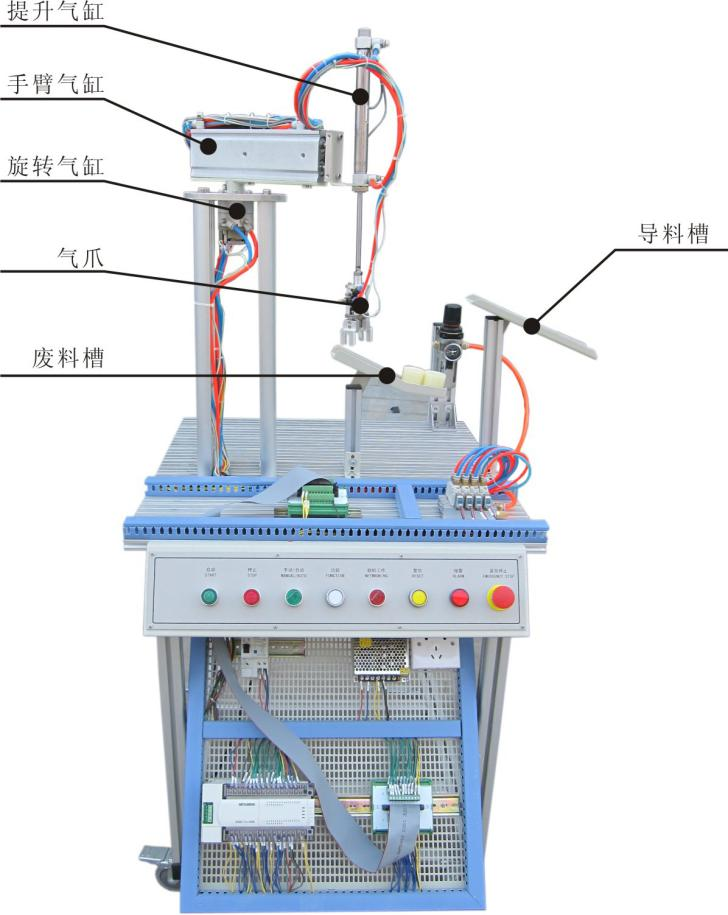机械手搬运转移站的主要功能是将加工合格的工件传送到分拣单元,而将加工不合格的工件放置到本单元的废料槽中。整个搬运装置由旋转气缸、标准气缸、伸缩气缸及气爪等多种气动执行元件组成。