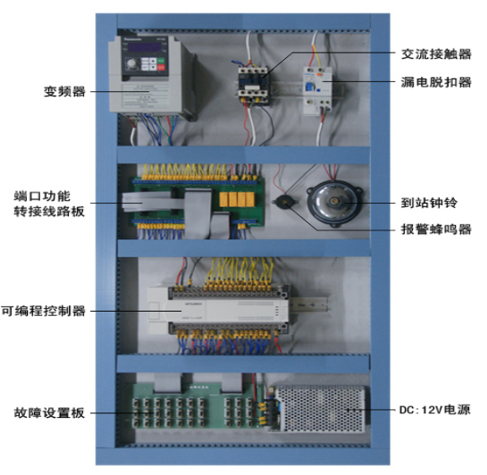 电梯的电气控制系统采用 PLC和交流变频调速控制,其硬件结构的组成及功能与实际电梯完全一样。具有自动平层、自动关门、顺向响应轿内外呼梯信号、直驶、电梯安全运行保护以及电梯急停、慢上、慢下、照明、风扇等功能,性能可靠、运行平稳、操作简单、能耗低,特别适合于教学。