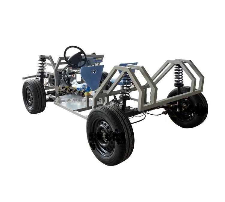 前桥总成、后桥总成、前悬架总成、后悬架总成、转向系统总成、前驱手动变速器、车轮、驱动电机、刹车总泵、刹车分泵、刹车碟、离合器、变速器、等速半轴、挂档机构、可移动铝合金台架。