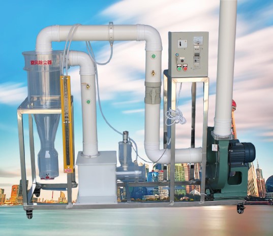 旋風除塵器系利用含塵氣體的流動速度,使氣流在除塵裝置內沿某一定方向作連續旋轉運動,粒子在隨氣流的旋轉中獲得離心力,導致粒子從氣流中分離出來。旋風除塵器具有結構簡單、造價低、設備維護修理方便的優點,而且可用于高溫含塵煙氣的凈化,也可用其回收有價值的粉塵。本實驗系統主要用于演示旋風除塵過程的原理。