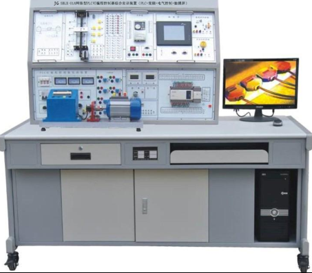PLC 可编程控制器综合实训装置由控制屏、实训桌、主机实训组件、实训模块(含丰富的工业现场设备模拟实训对象)、变频器挂箱、触摸屏挂箱、交直流电机、总线单元、通信模块、电机导轨、测速机构等组成。
