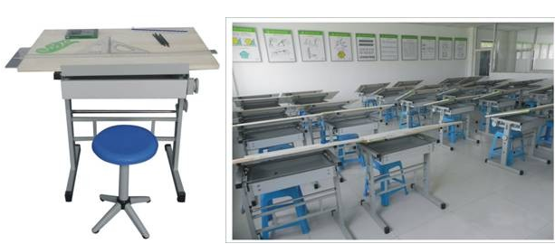 多功能实用绘图桌 升降绘图桌支架采用钢架结构,桌面板采用东北优质加厚椴木材料的1号绘图板,并可调节倾角0°-85°,桌面下部有储物隔板,可以放置书包、文具和图纸等物品,牢固耐用,适用于机械制图绘图和绘画专业,在院校内实用和经济的一款多功能和升降绘图绘画桌,有较强的多种行业和课程的兼容性和普及性。