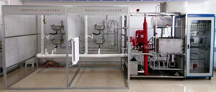 建筑给排水电气及自动化实训系统整体采用铝型材框架和网孔板进行设计,主要给排水管道设备安装在钢架底座上、具备开放式的特点,由生活给水系统、消防给水系统、热水给水系统、排水系统、污水处理系统和控制系统六个部分组成。